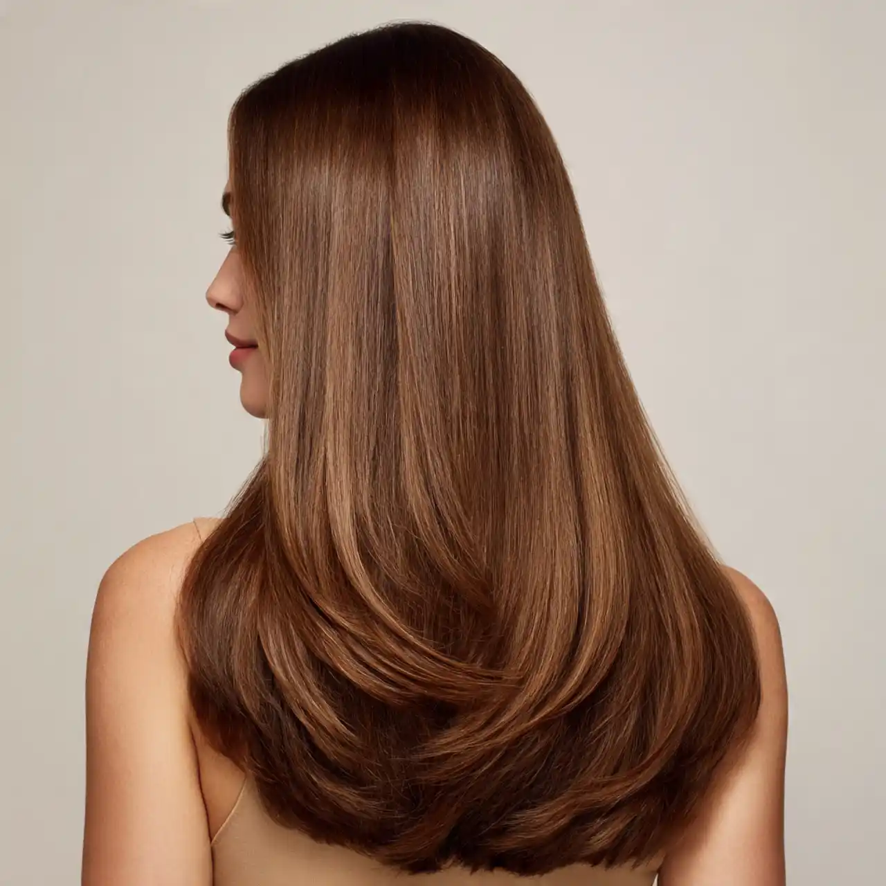 This version keeps the layers soft and well-blended. The shorter layers add lift at the crown, while the long layers stay sleek and straight. The hair looks light but still full. This is a safe and flattering option for first-time butterfly cuts.