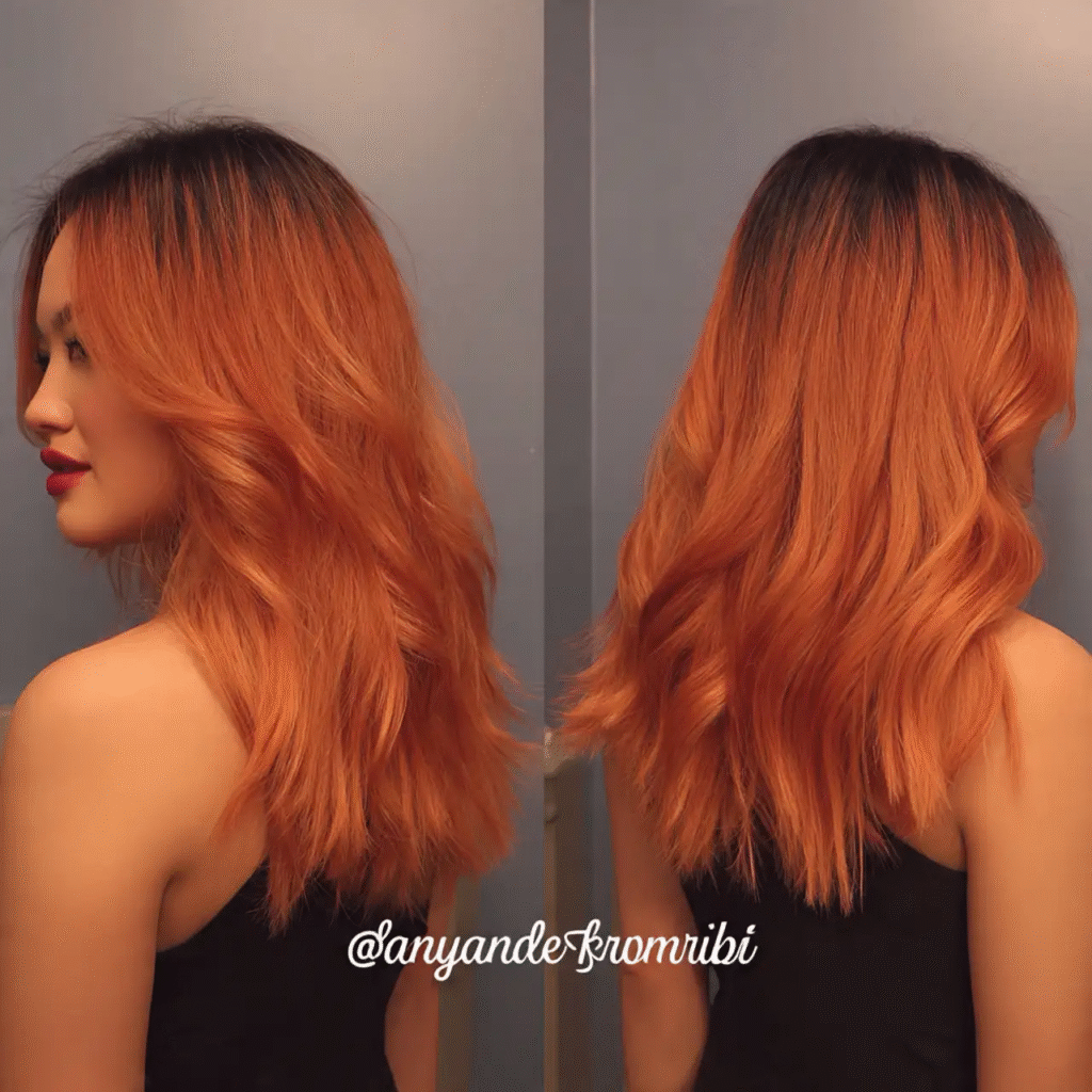 Bright copper balayage creates a bold, fiery pop against black hair. It’s the perfect way to add warmth and dimension, making your hair look full of life and vibrant.