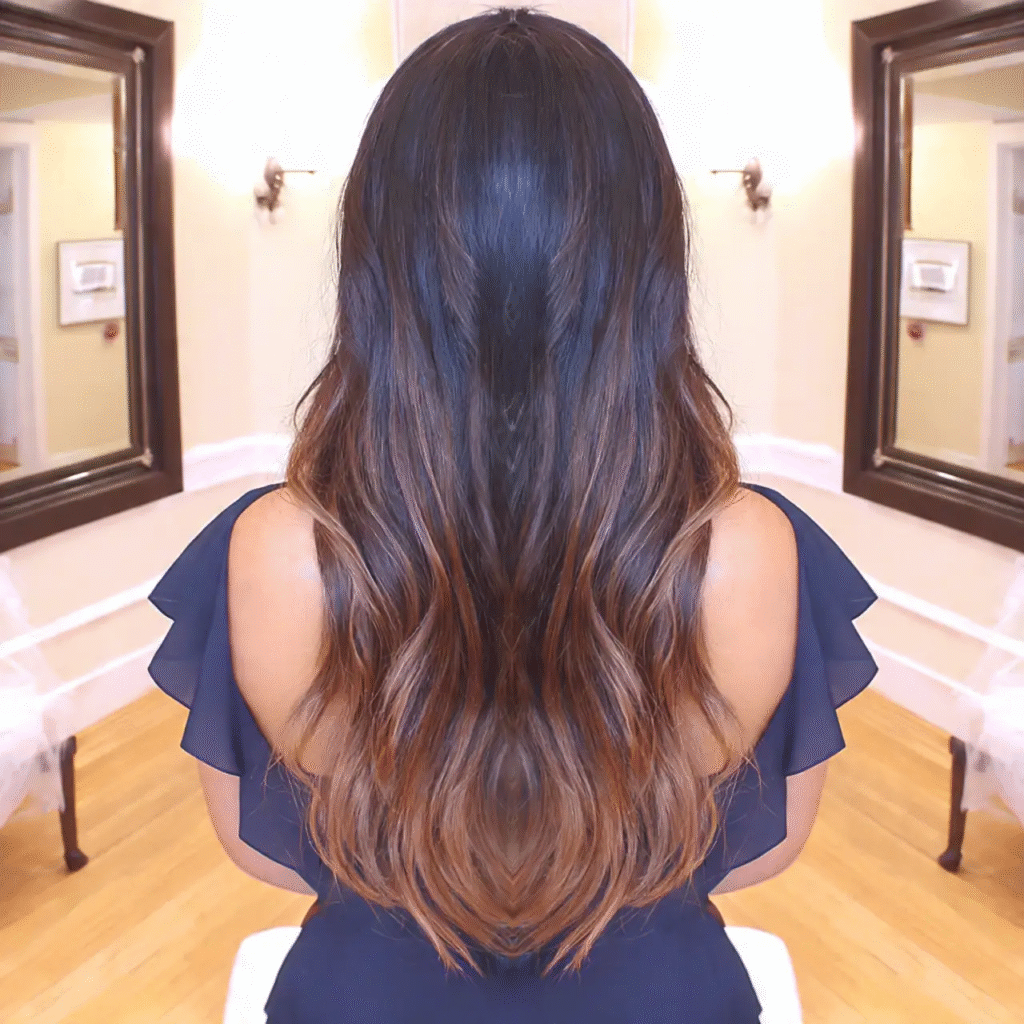 Bronze balayage on black hair is all about creating a rich, dimensional effect. The warm, reddish-brown tones add a luxurious glow that isn’t too overpowering but still gives your hair a radiant shine.